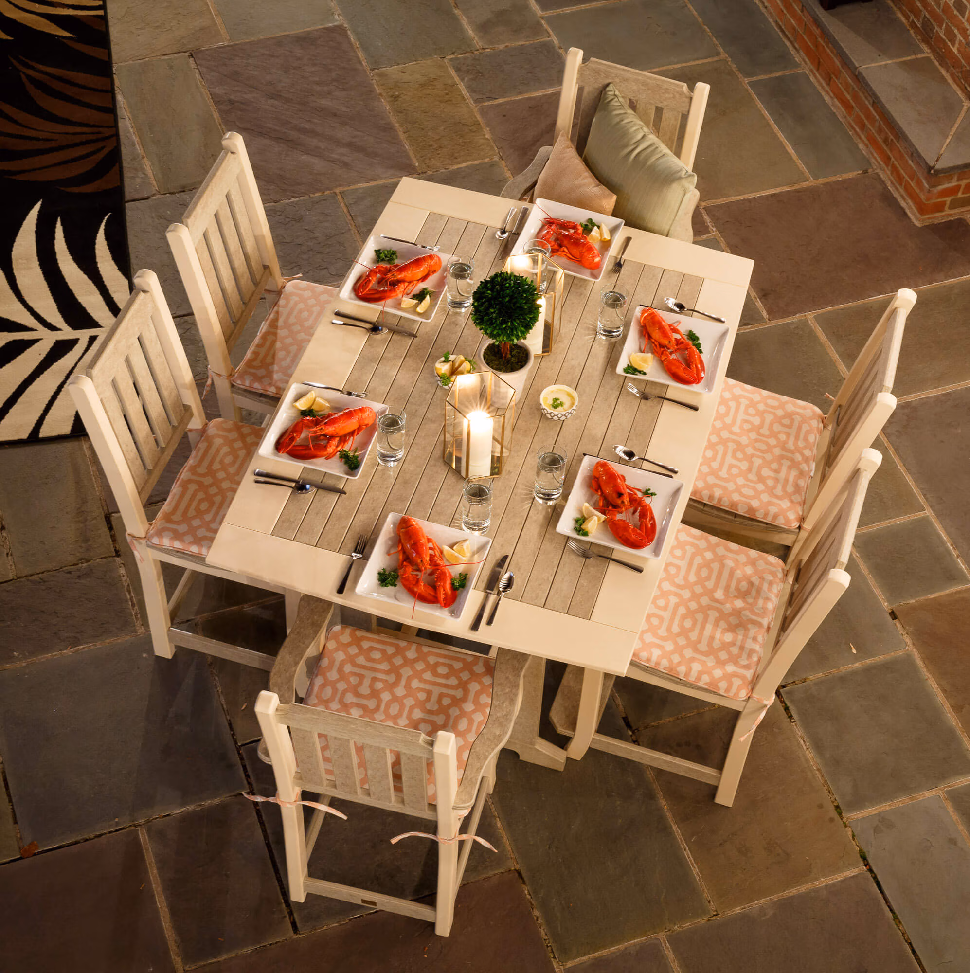 These outside tables and chairs come in several different shapes and sizes. In addition to rectangular and round patio tables, we also offer square and half round tables. Add your choice of chairs, stools and cushions to complete your outdoor patio dining set.