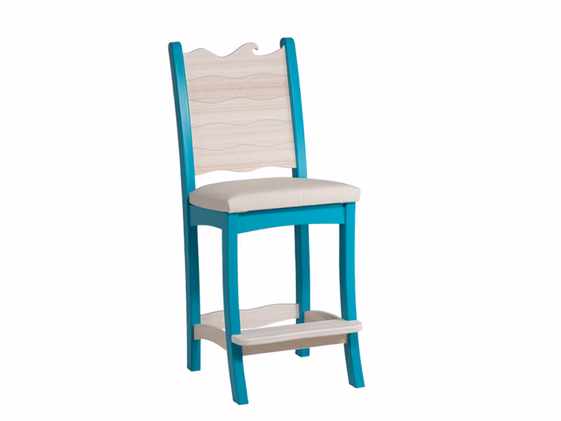 Enjoy the Wave Bar Chair with its wave outlines and ripply lines in the back and leg supports. This bar height poly chair includes seat and back cushions made with Sunbrella fabric for added comfort and visual variety. Both chair and cushion are weather-resistent, and designed for easy maintenance and extreme durability even in salty ocean air. Cushions are directly incorporated into the seat, so you never have to worry about cushions blowing away even in heavy winds. Designed to be paired with the Wave Bar Table and the Wave Surfboard Bar Table. Customize yours by selecting up to 2 of Finch’s 28 poly colors to create hundreds of unique color combinations!