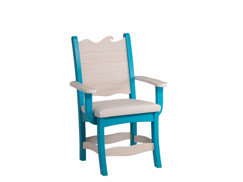 Enjoy the Wave Dining Chair with its wave outlines and ripply lines in the back and leg supports. This chair comes with arms so it can be pulled away from the table and used for more casual seating, and includes seat and back cushions for added comfort and visual variety. Both chair and cushion are weather-resistent, and designed for easy maintenance and extreme durability even in salty ocean air. Cushions are directly incorporated into the seat, so you never have to worry about cushions blowing away even in heavy winds. Designed to be paired with the Wave Dining Table and the Wave Surfboard Dining Table. Customize yours by selecting up to 2 of Finch’s 28 poly colors to create hundreds of unique color combinations!